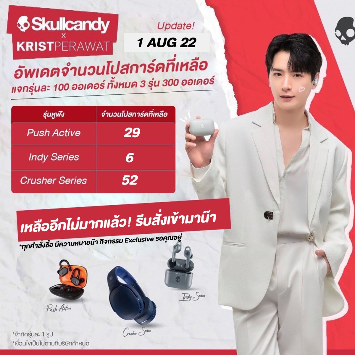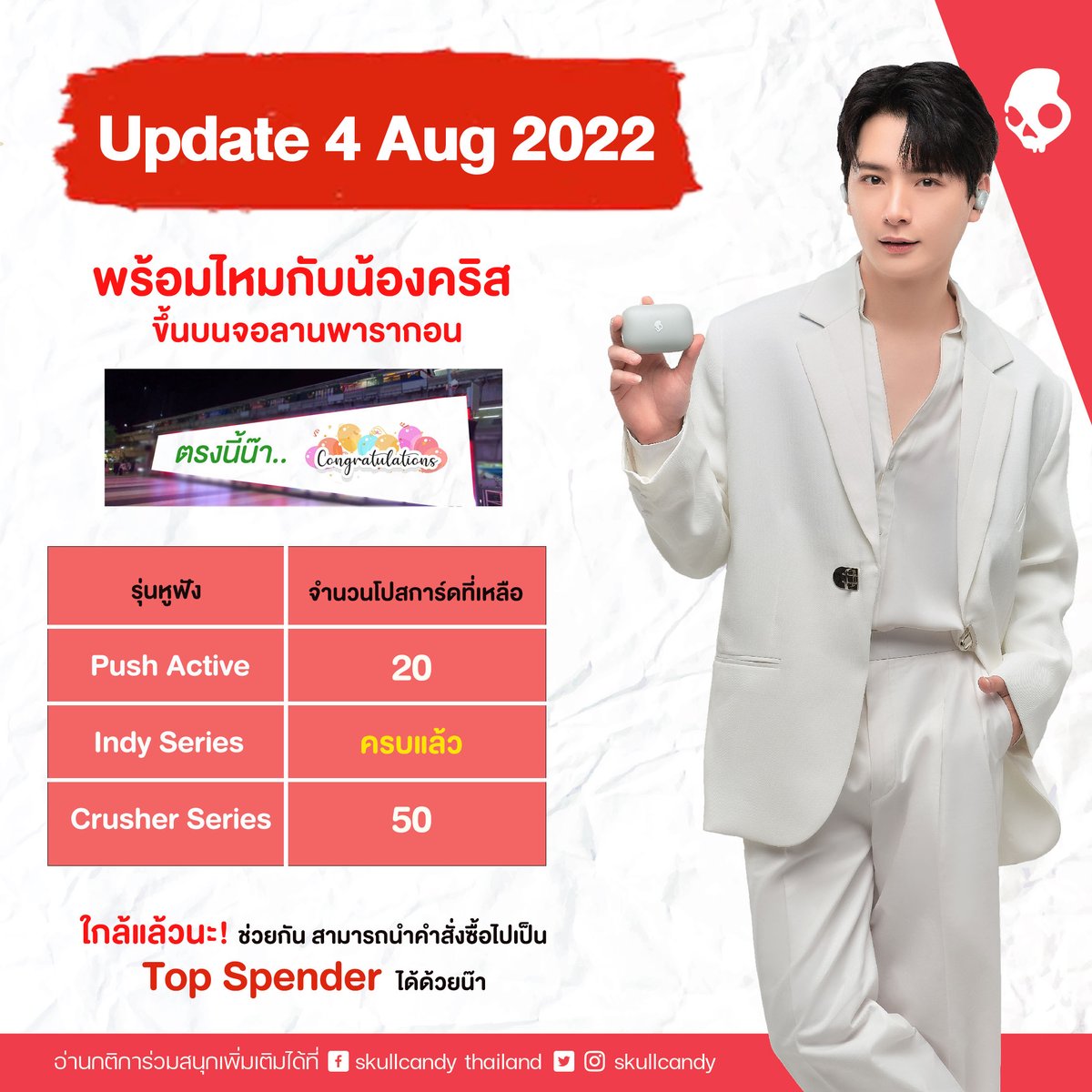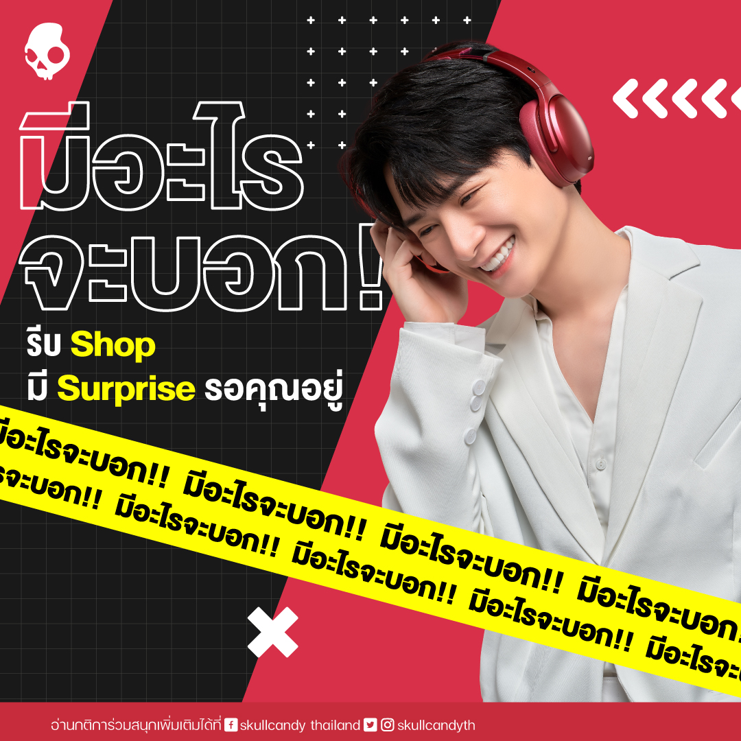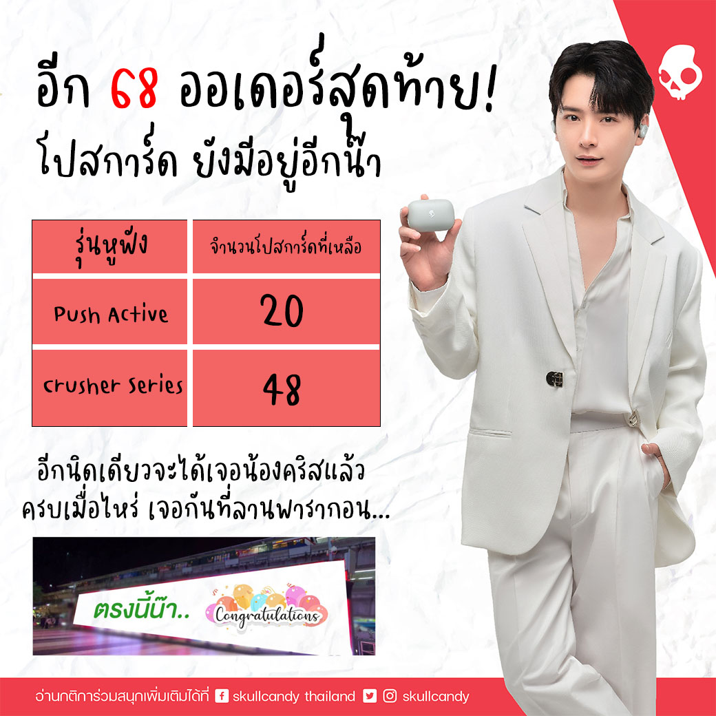Skullcandy Thailand โดยบริษัท Mentagram ขอขอบคุณทุกการสนับสนุนและการต้อนรับอย่างอบอุ่น เราเตรียมกิจกรรมร่วมกับพรีเซนเตอร์และแฟนคลับไว้ หลังจากนี้ขอให้ติดตามเป็นกำลังใจด้วยนะครับ