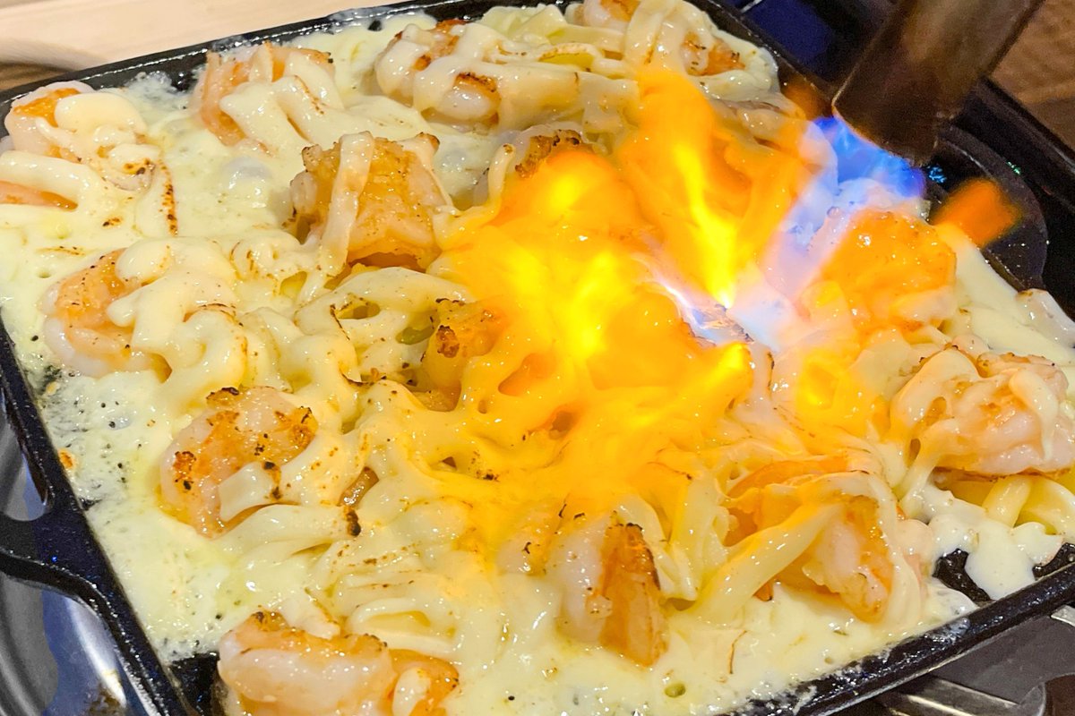 バーナーで炙る「ガーリックエビフォンデュ」を食べられるお店。