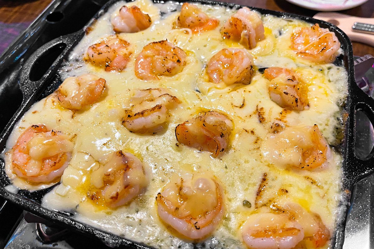 ガーリックソースに漬け込んだエビにチーズをのせて豪快に炙ると、香ばしい香りが充満する罪深い逸品!