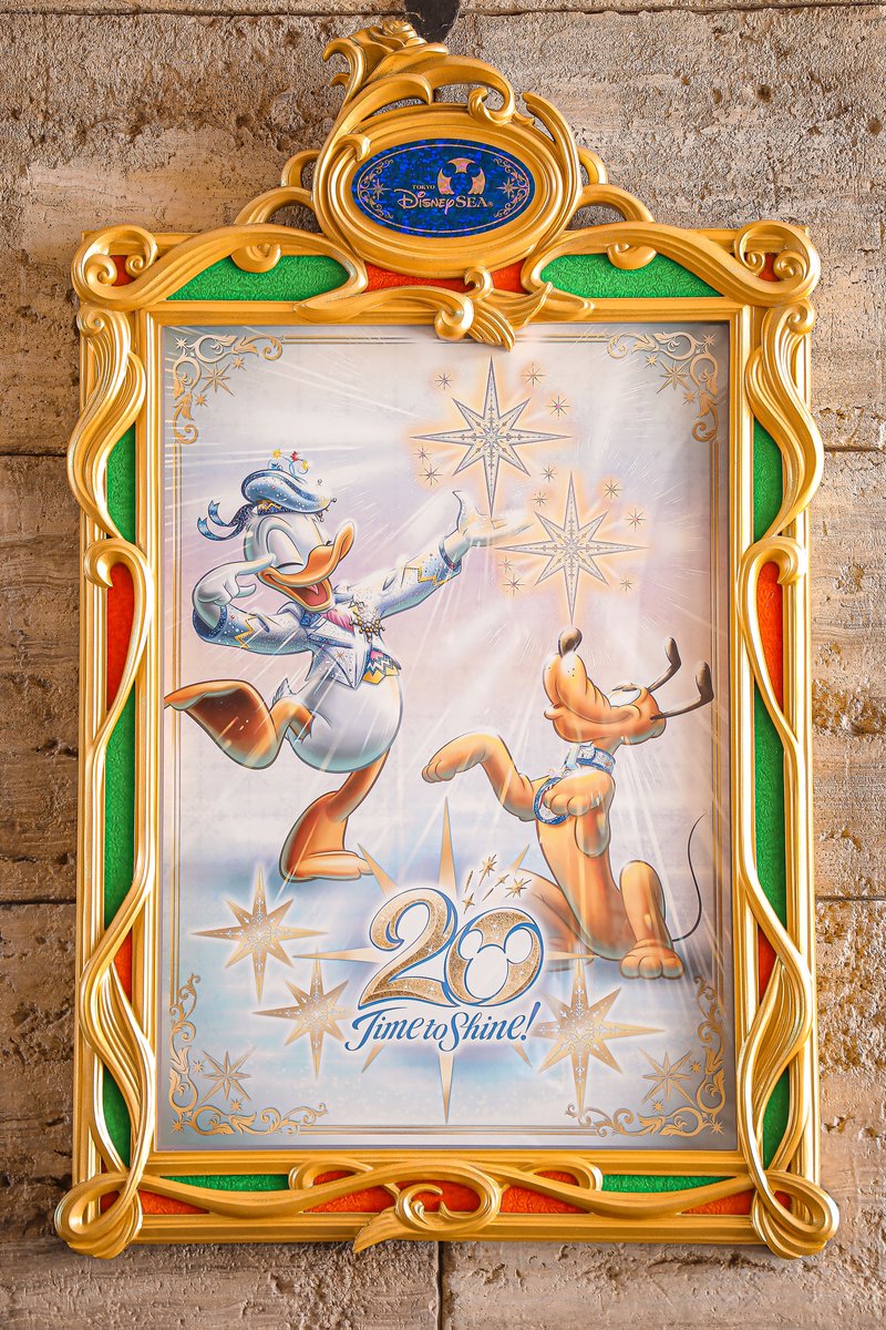 ディズニーシーのミラコスタ通りに飾られた 20周年を記念したミッキーたちのポスター。
