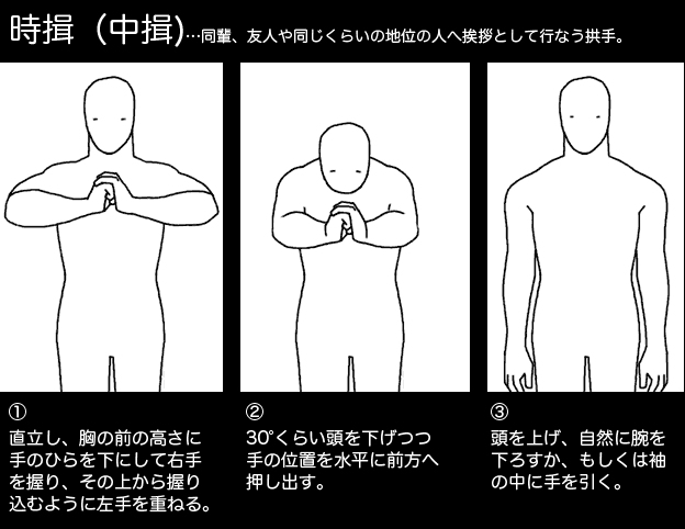 拱手(揖礼)の形は昔描いたこれでだいたい合ってると思うっす ただし時代によって作法は違うので、推し時代のものを採用したらいいと思うっす なお揖という字は「いぼのいと」で一発で出ます👍