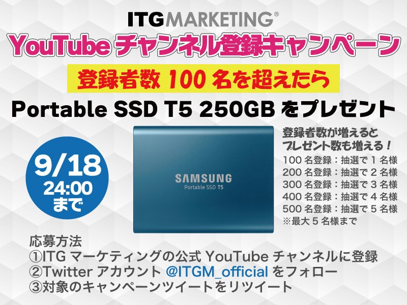 ITGM公式YouTubeチャンネル(bit.ly/2Qhvml7)の開設を記念して、キャンペーン期間【9/18】までに登録者数【100名】を超えたら、「チャンネル登録&@ITGM_officialフォロー&本ツイートをリツイート」いただいた方の中から抽選で「Samsung Portable SSD T5 250GB」を1名様にプレゼント!