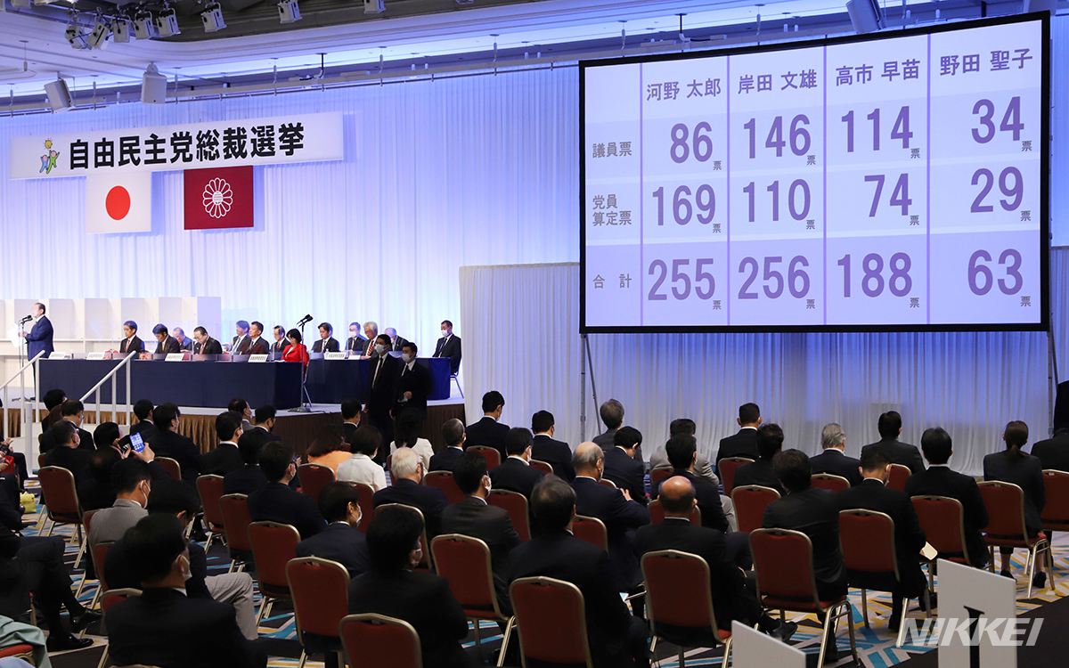 自民党総裁選は1回目の投票で過半数を得た候補がなく、岸田、河野両氏による決選投票に入りました=上間孝司撮影