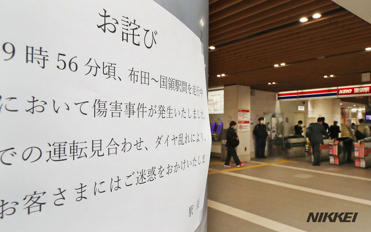 京王線特急内での乗客刺傷事件で列車が緊急停止した国領駅。事件から一夜明け、運転を見合わせたことへのおわびが掲示されるなか多くの人が行き交っていました=井上容撮影