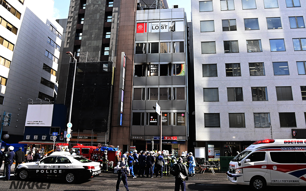 17日午前10時20分ごろ、大阪市北区曽根崎新地のビルで、「4階が燃えている」と119番がありました。大阪市消防局によると、4階の約20平方メートルが燃え、27人が心肺停止となっているほか、負傷者も出ています。正午ごろ、周囲は騒然としています=森山有紗撮影