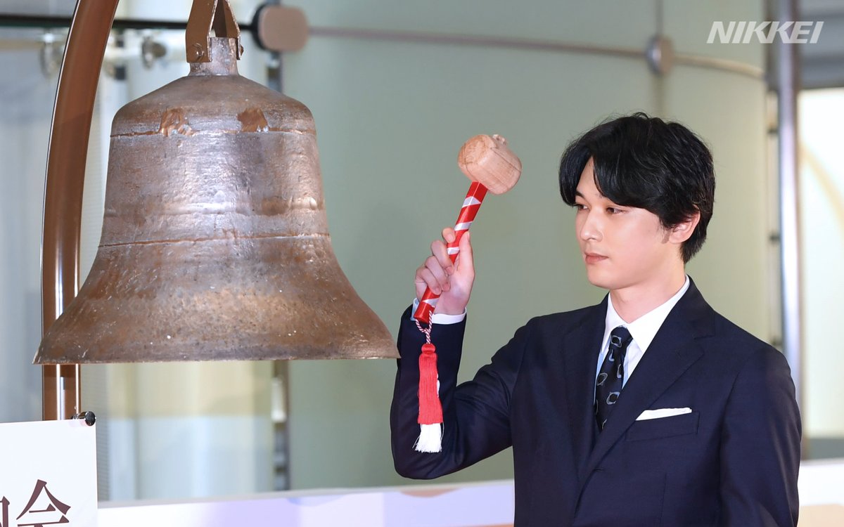 東京証券取引所で30日、2021年最後の取引終了後に催事「大納会」が行われました。NHK大河ドラマ「青天を衝け」で渋沢栄一を演じた吉沢亮さんが、鐘を打ちました=高橋鈴撮影