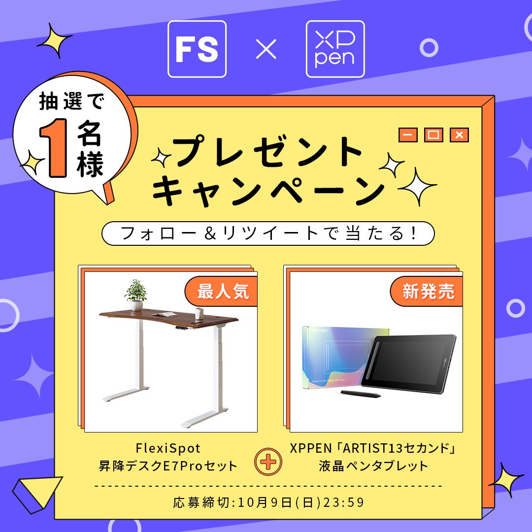 抽選で1名様にXPPen最新の液晶ペンタブレット「Artist13セカンド」とFlexiSpot昇降デスクE7proセットをプレゼント🎁🎁🎁