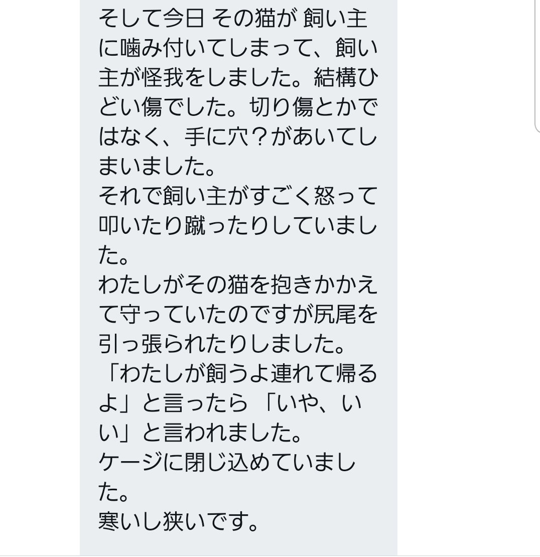 もしかしたら、私は明日以降社会的抹殺と同時に殺されるかもしれません...日曜日に私の管理不足で風邪を拗らさせてしまった猫ちゃんを病院に連れて行った時、怒りで猟銃持って来ようかと思ったとお話されてました...今恐怖でいっぱいで眠る事も出来ません...