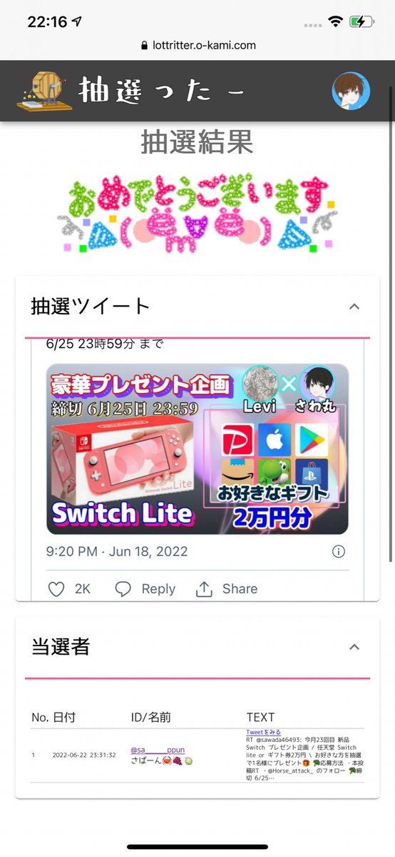 抽選結果はツイートにて発表します。