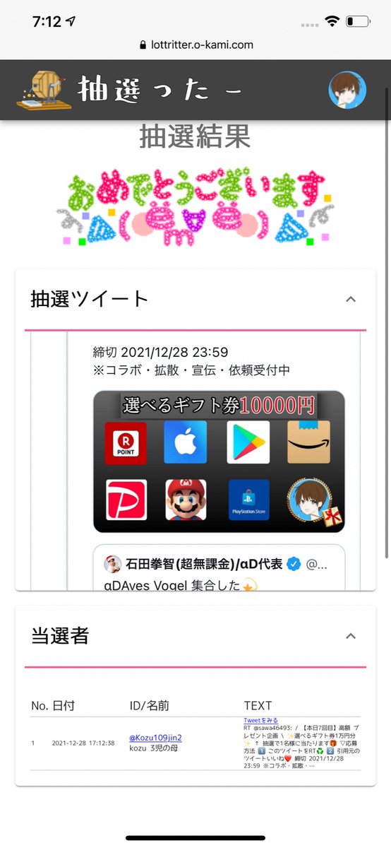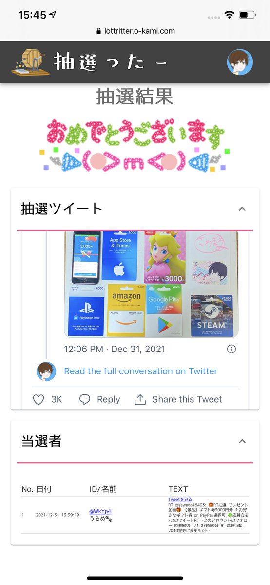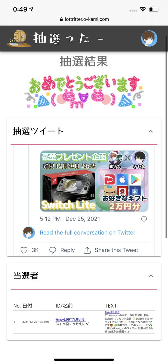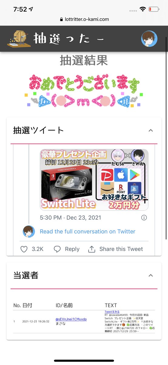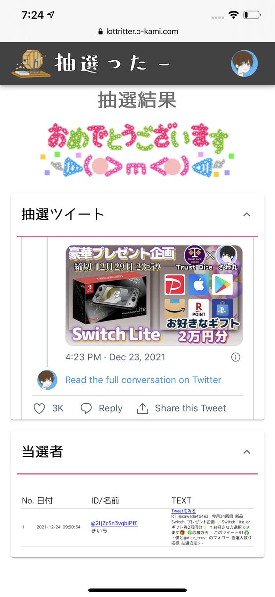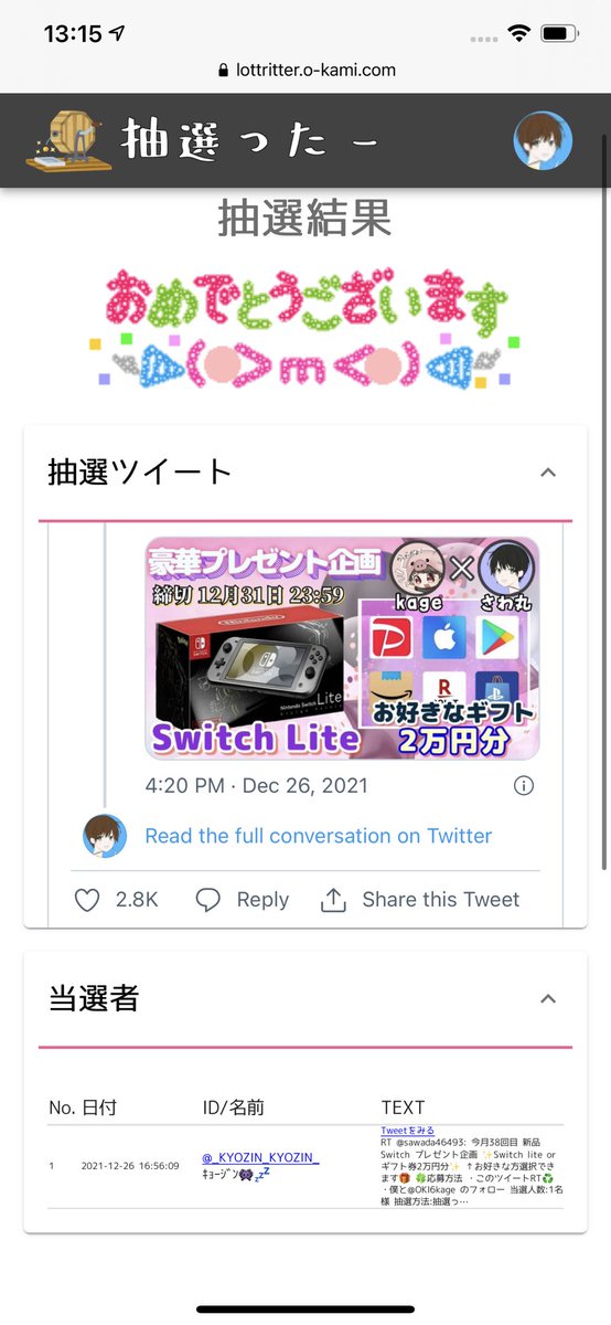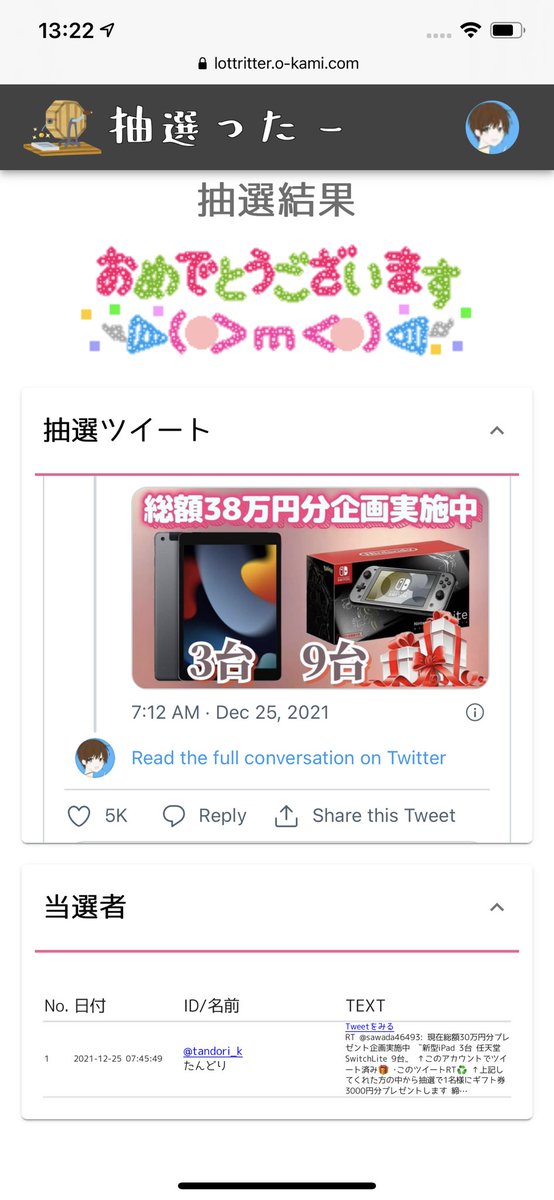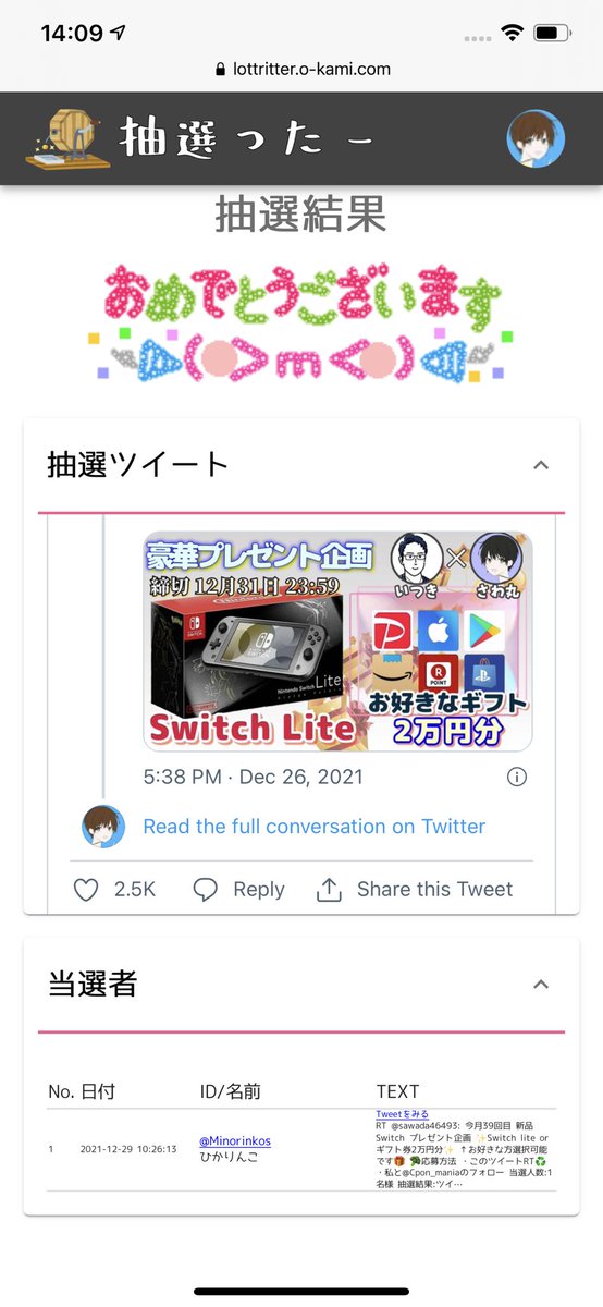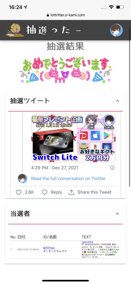 当選人数:1名様 抽選結果:ツイート発表