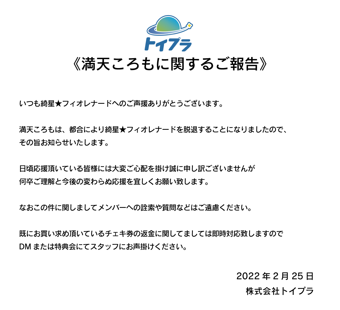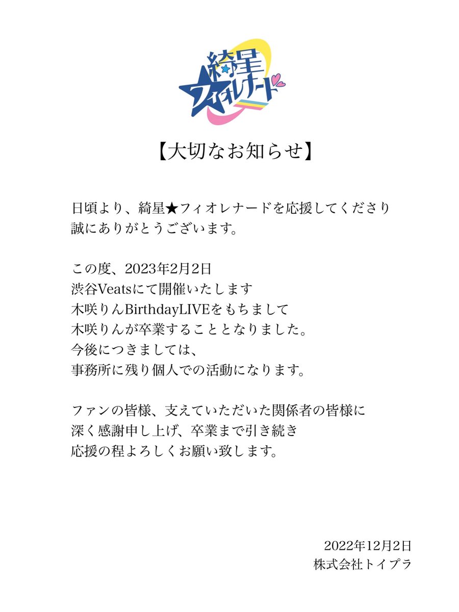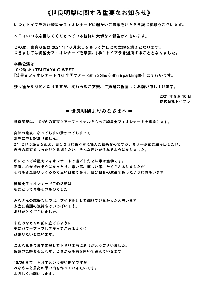 白瀬乃愛は1/23の公演をもって綺星★フィオレナードを卒業し、煌めき☆アンフォレントへ移籍致します。