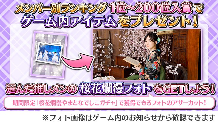 さらにメンバー別ランキング報酬では「桜花爛漫やまとなでしこ」のアザーカットフォトを獲得できます✨
