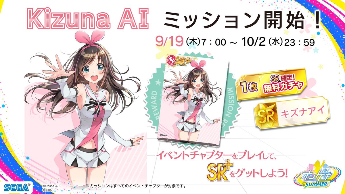 【9/19(木)『キズナアイ』ミッション開始!】9/19(木)~10/2(水)の期間で、イベントミッション「キズナアイ」を開催!イベントチャプターをプレイして、期間限定【SR+】カードとネームプレートをゲットしよう! ongeki.sega.jp/news/20190917/