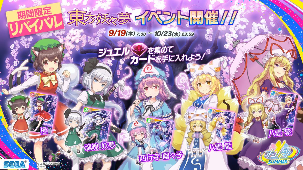 【9/19(木)『東方永夜抄』イベント開始!】9/19(木)~10/23(水)の期間で、東方永夜抄とのコラボイベントを開催します!ジュエルを集めて、描き下ろしコラボカードをゲットしよう! ongeki.sega.jp/news/20190918/