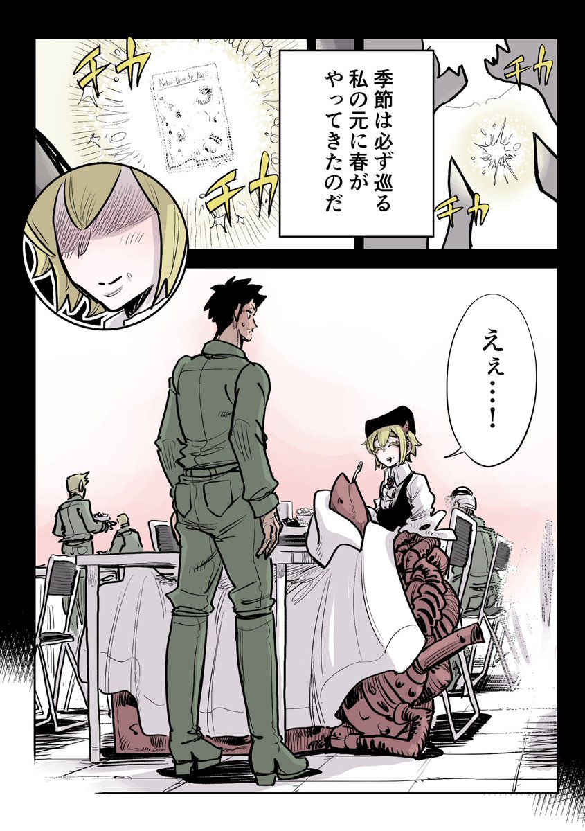 両腕が巨大な武装腕の少女に兵士が「あーん」させる話