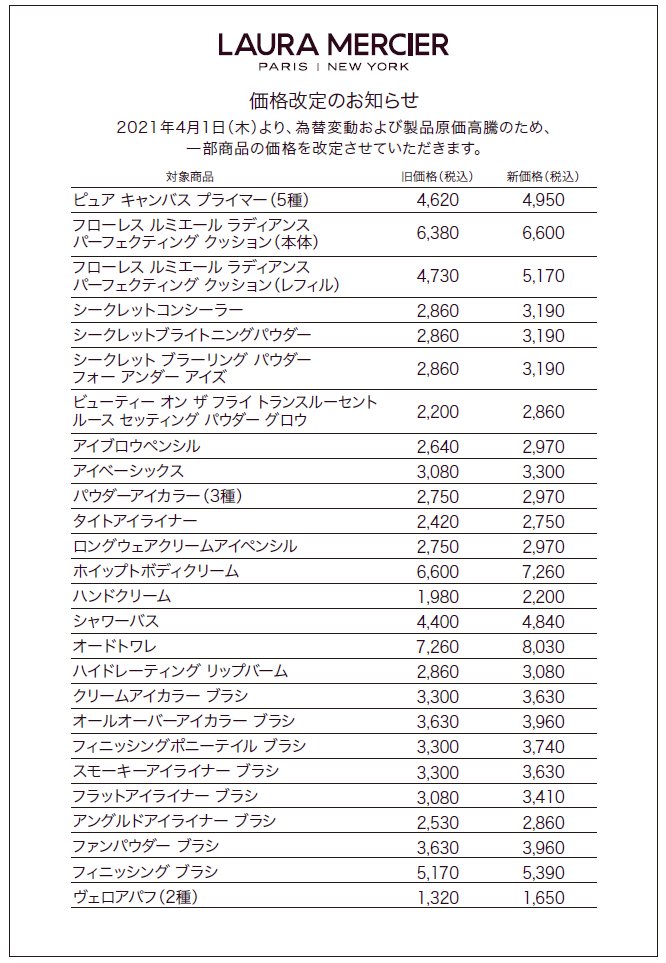 【ローラ メルシエ価格改定のお知らせ】