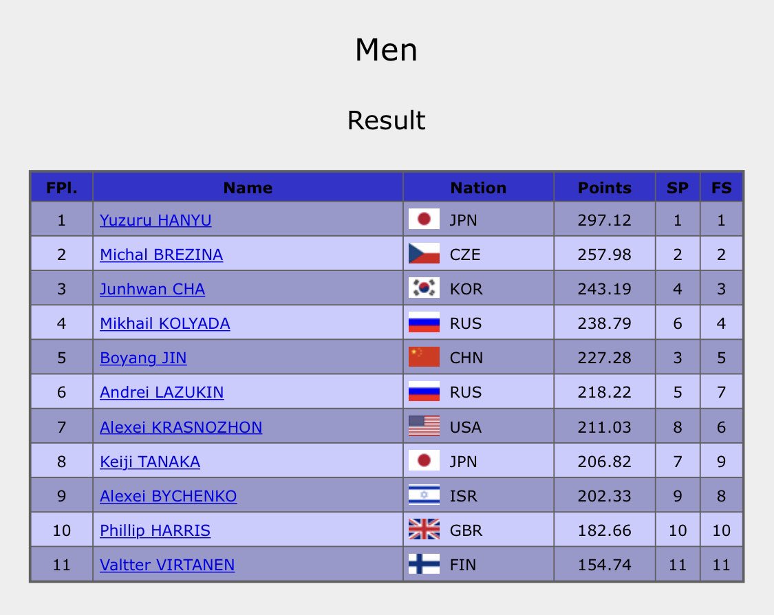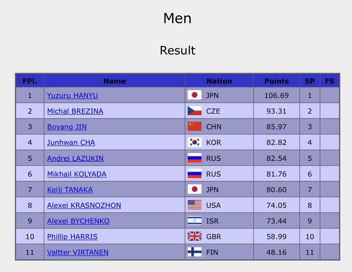 【GPS NHK杯 男子結果】
