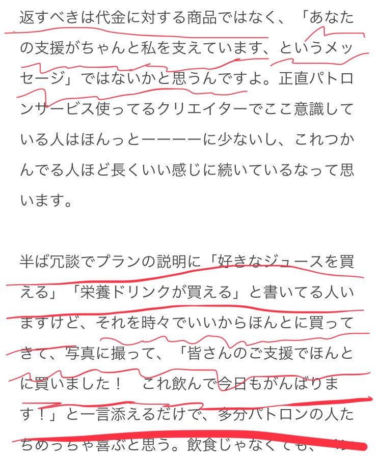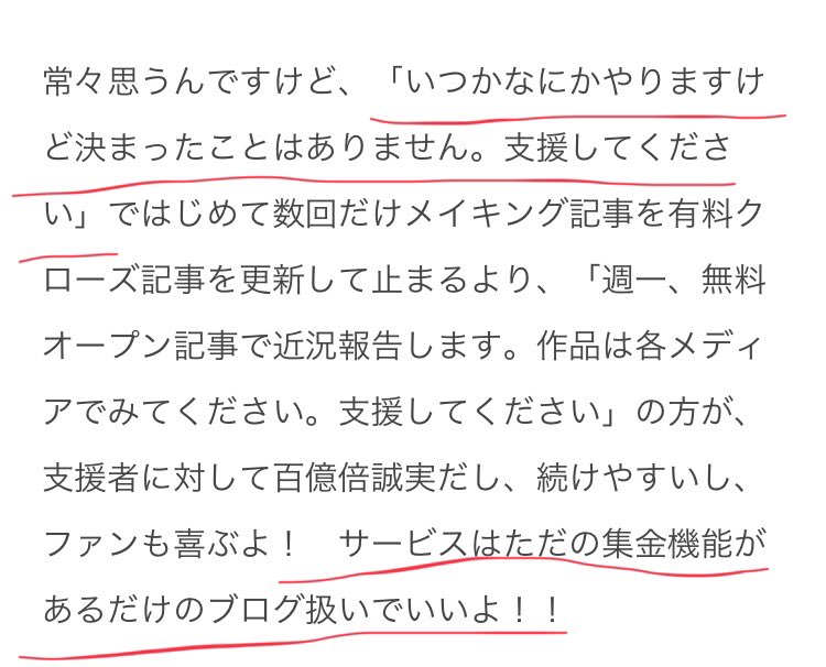 クリエイター支援のサービスについての記事。めっちゃ同意できる部分に赤線引きました note.mu/noka_natukusa/…