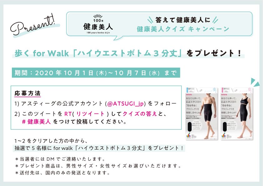 アツギ健康美人サイトをみて答えを探そう☺️フォロー&クイズの答えに #健康美人 をつけて引用リツイートで応募!