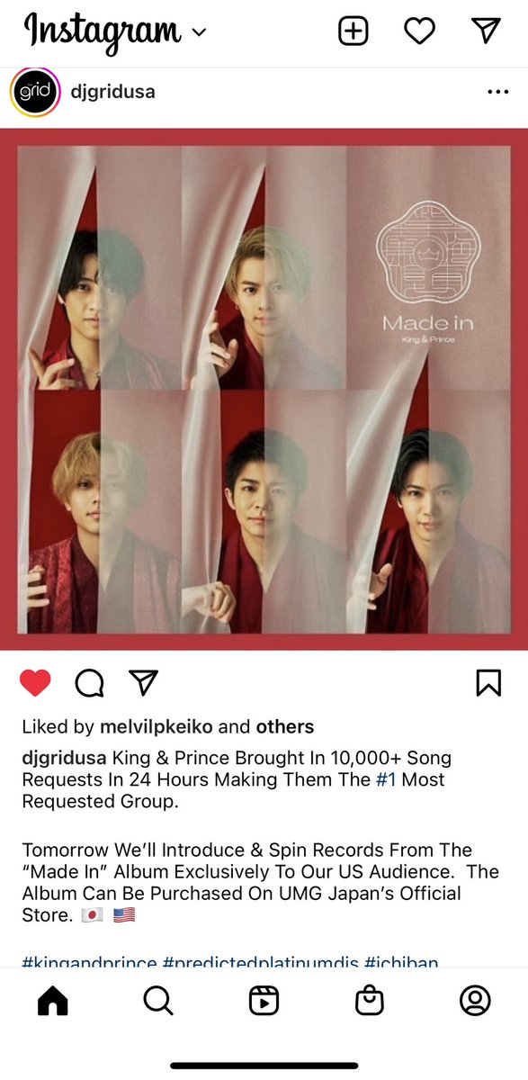 DJ Gridさんのインスタで、24時間以内になんと10,000以上のリクエストがあったNo.1 Most requested GroupっていうことでMade inアルバムを明日紹介してくれるそうです‼️