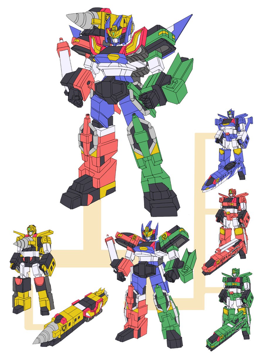 オリジナル勇者のサブロボ副官枠 ファイヤートレイン(赤)、ジェットトレイン(青)、ビルドトレイン(緑)の3体が 特急合体!!ガードトレインになるぞ!