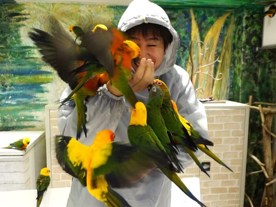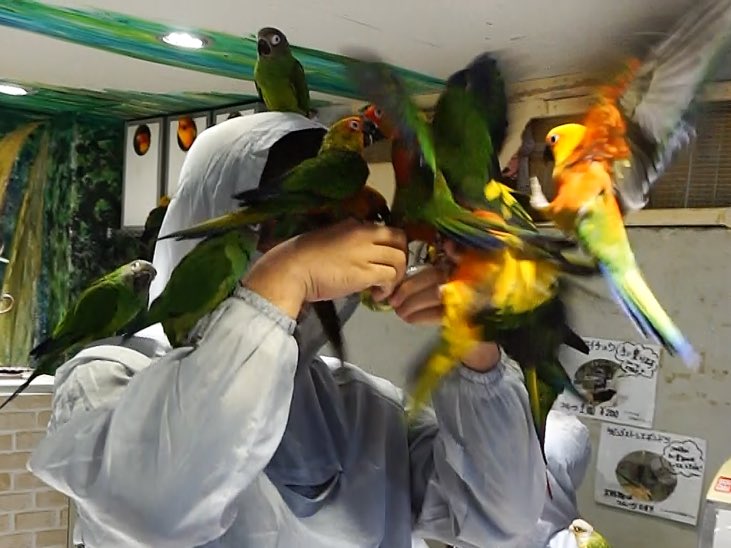 ここの鳥たちは、普段は穏やか。頭に乗ったりしてすごい可愛いんだけど、餌を出した瞬間豹変する!無数の鳥たちが餌を目指して群がってくる!