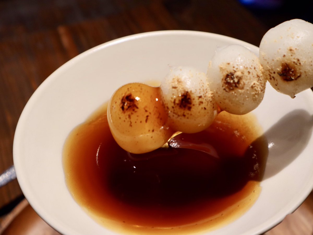 注文すると七輪が運ばれてきて、その上で自分でお団子を焼いてタレをつけて食べる。