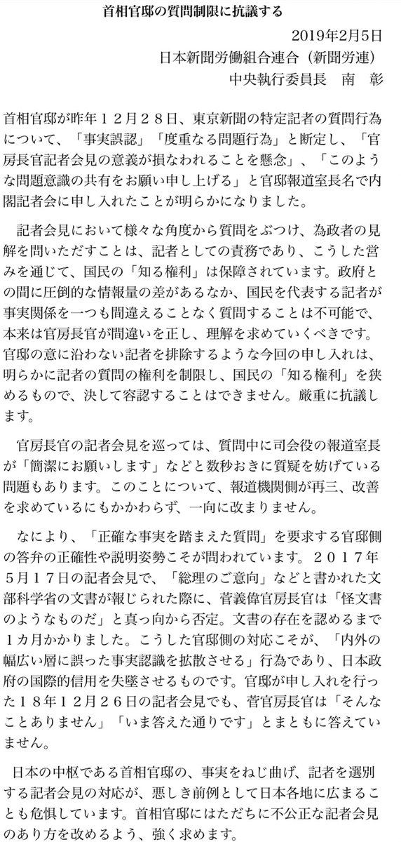 新聞労連の声明全文はこちら。|首相官邸の質問制限に抗議する・shinbunroren.or.jp/seimei/2019020…