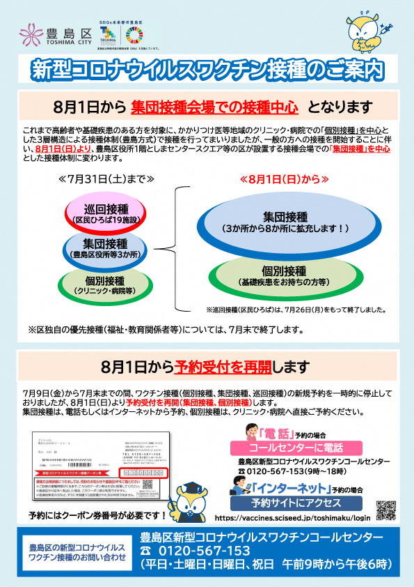 本日正午より豊島区歯科医師会館の予約枠を拡大します。現在その他の集団接種会場も予約に空きがありますので、区ワクチンコールセンターまたは予約サイトにてご予約ください。