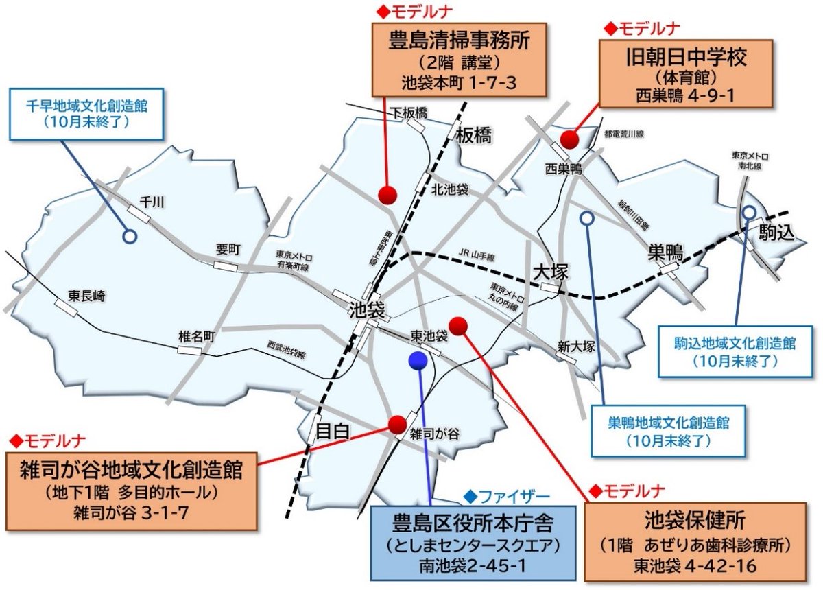 9月14日(火)午前9時から、10月2日分からの「モデルナ社ワクチン」接種会場の予約受付を開始いたします。会場は豊島清掃事務所、旧朝日中学校、雑司が谷地域文化創造館の3会場です。