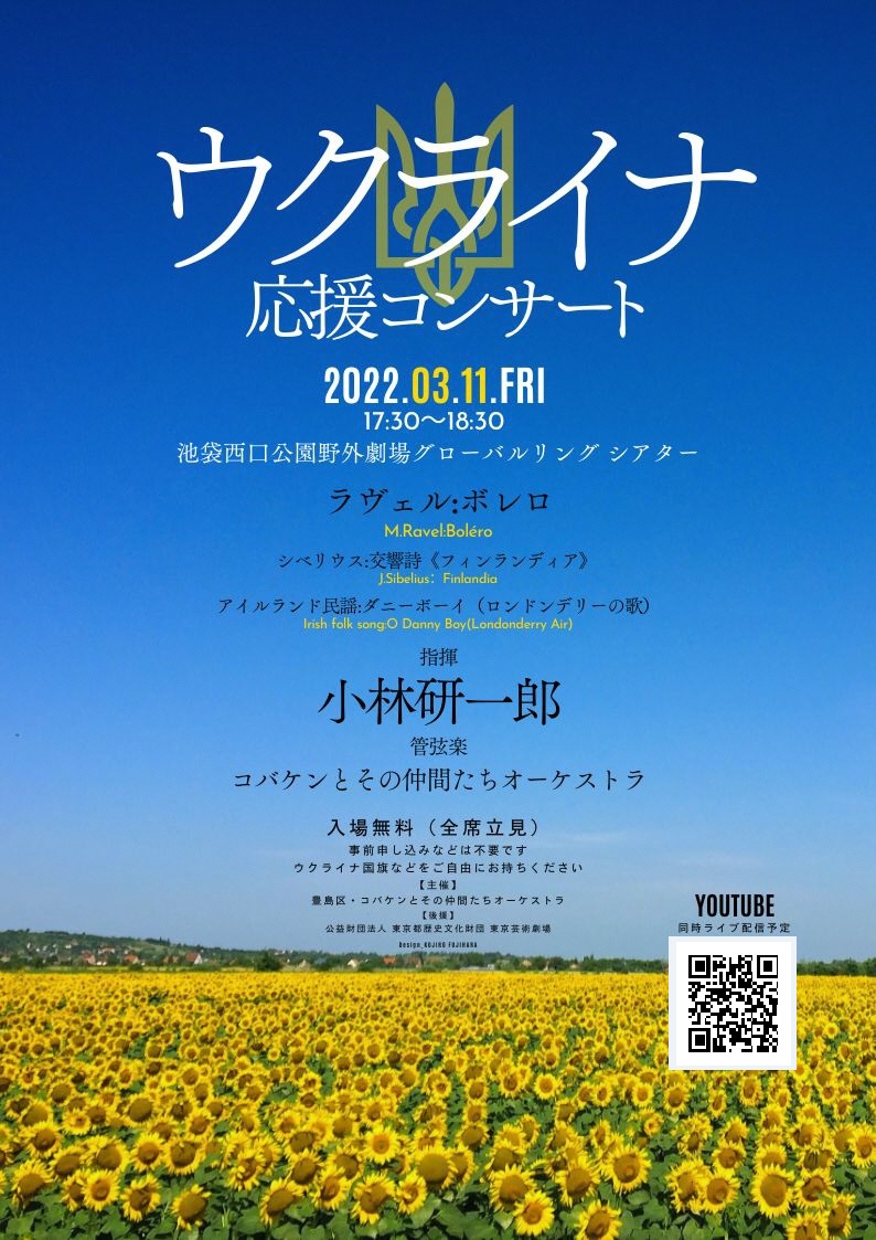 【緊急決定!】区は11日(金)、コバケンとその仲間たちオーケストラ(指揮者:小林研一郎が率いる社会貢献目的としたオーケストラ)と共催し池袋西口公園野外劇場(グローバルリングシアター)にて『ウクライナ応援コンサート』を行います。詳細は区HPをご覧ください。