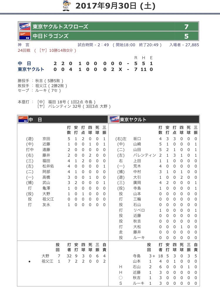 中日が1位に浮上。セはどこも2点台以下だね