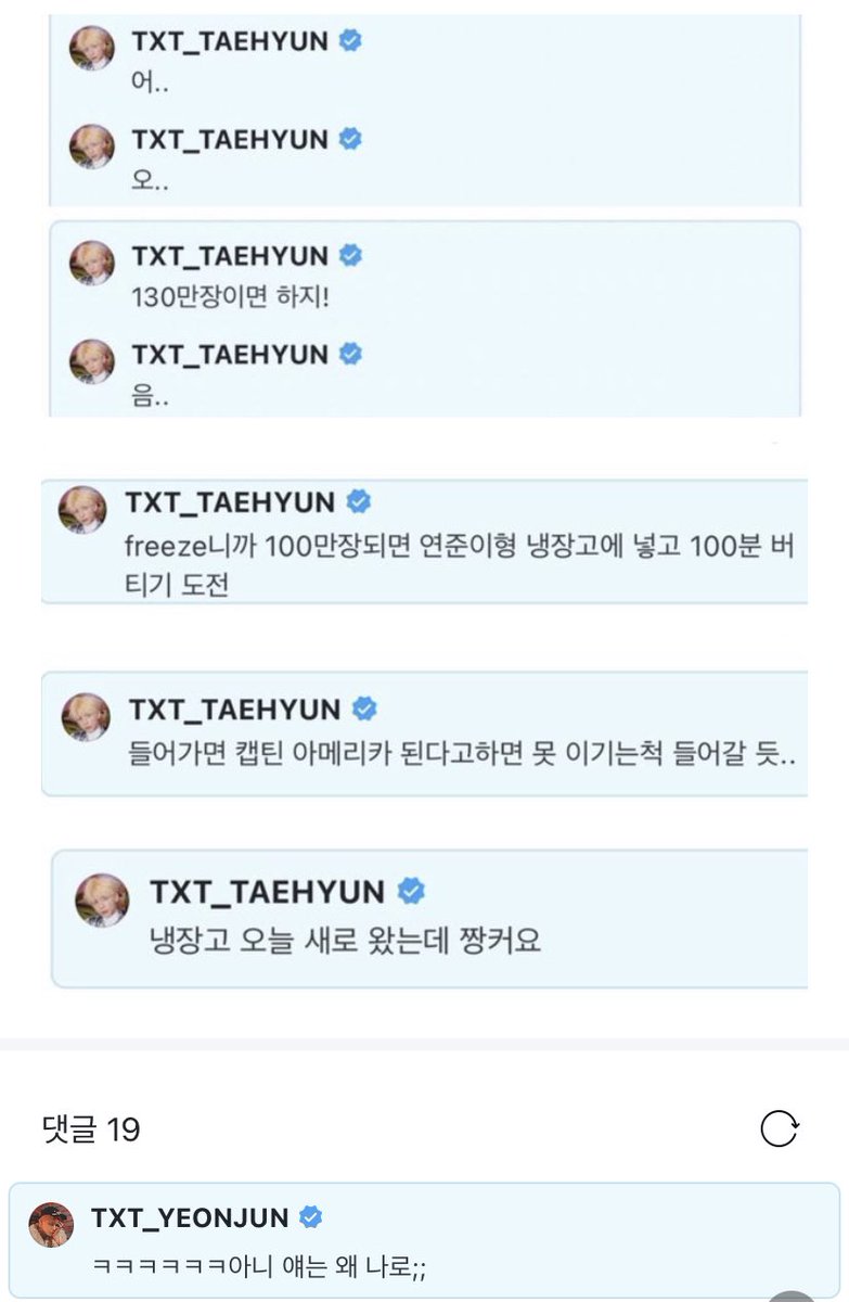 img: taehyun pledging to reveal soobin’s graduation picture and put yeonjun in the freezer once they sell 1m copies