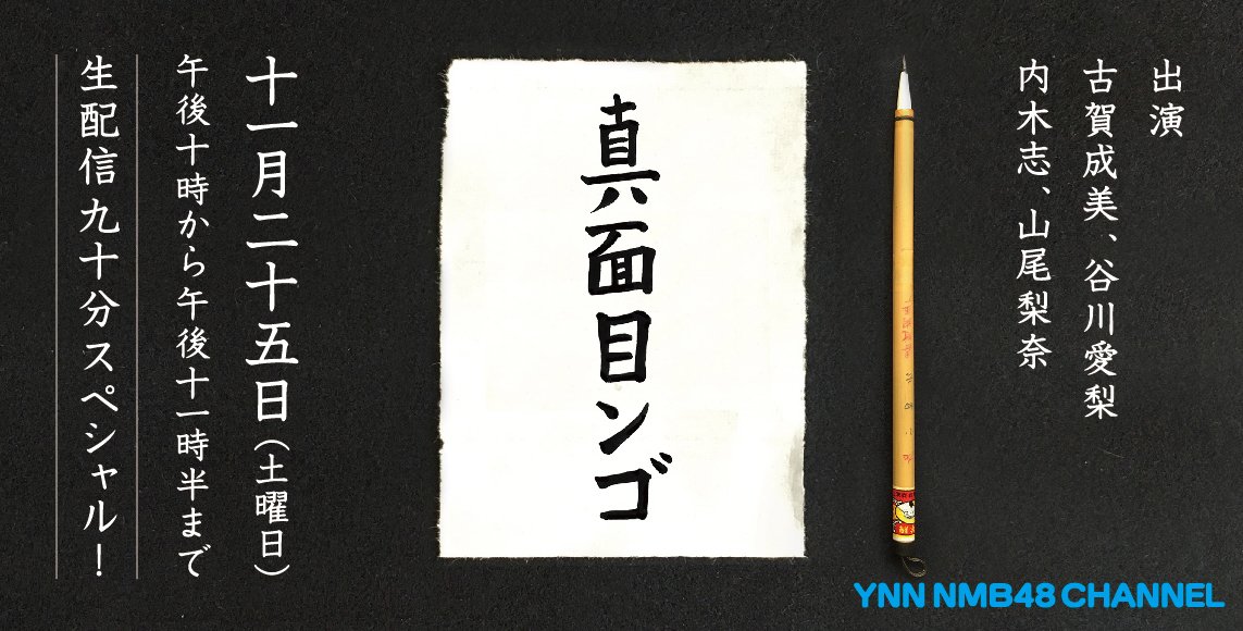 11/25(土)22:00からYNNにて「真面目ンゴ」生配信90分SP!出演:古賀成美、谷川愛梨、内木志、山尾梨奈。絶対見るンゴ!ynn.jp/feature/nmb48