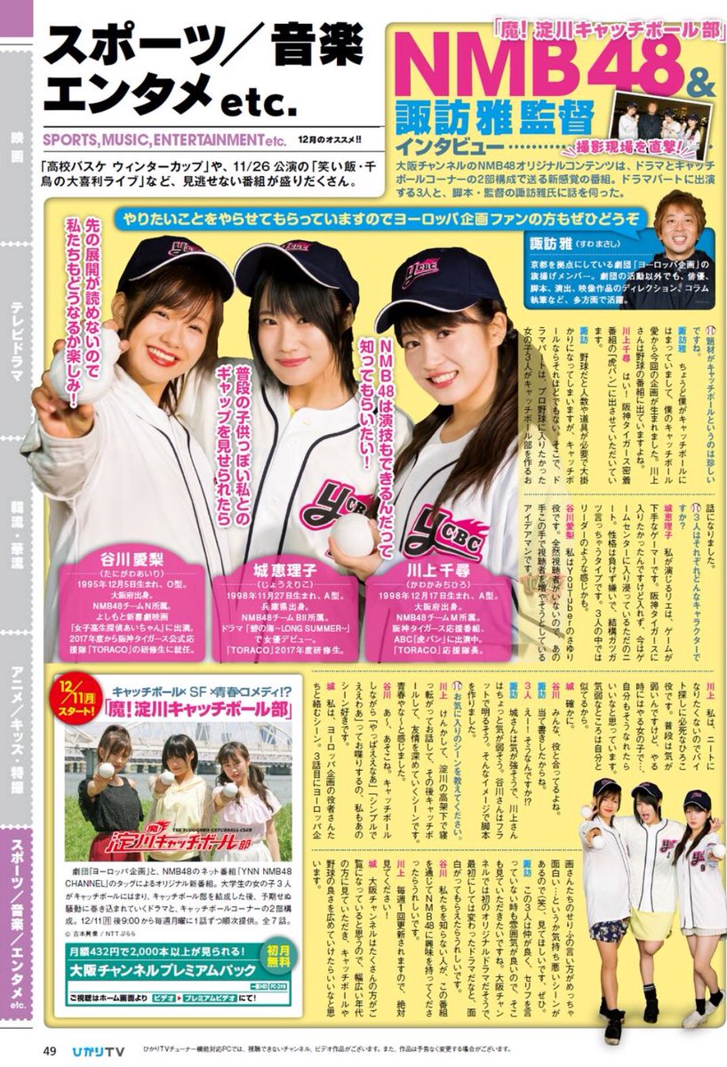 M-1でヤベーCM(笑)やってた大阪チャンネルで NMB48の「魔!淀川キャッチボール部」は12/11から配信開始!