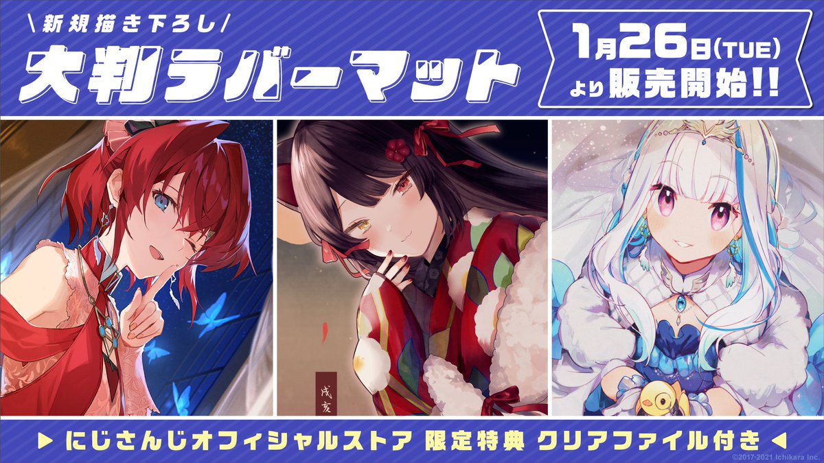 3名の描き下ろしイラストを使用した大判ラバーマットの第2弾を にじさんじオフィシャルストアにて販売開始いたします!
