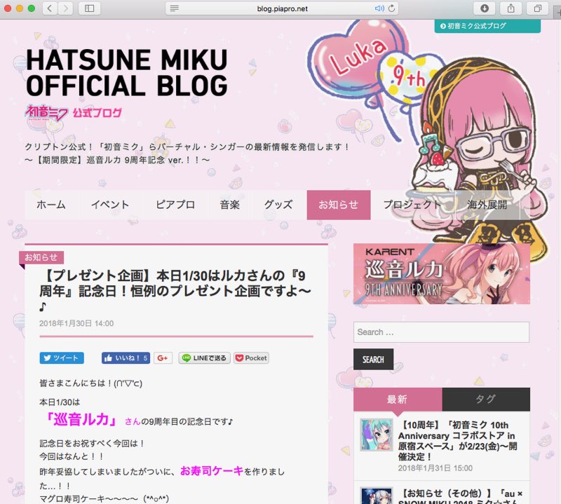 初音ミク公式ブログさんのルカさんジャックにイラスト使っていただいてます〜嬉しくてスクショしてしまいました。遅ればせながらルカさん9周年おめでとうございます!