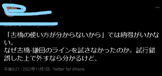 三笘薫がすぐに対応されるのは分かってんだから、後半は久保建英のダブルウイングで変化つけるプレー続ければいいだろ。なんでそれで点とった直後に変えてんねん、ありえねえ。あの監督サッカー知らねえだろ。