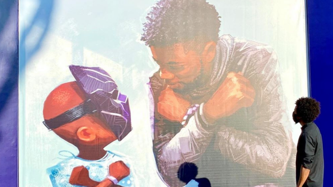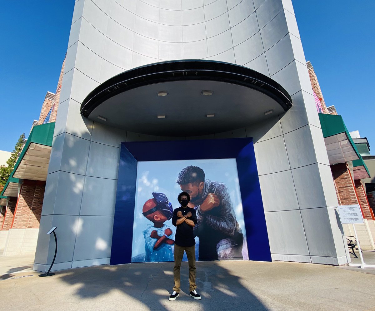 アナハイムのダウンタウン・ディズニーで、故チャドウィック・ボーズマンを追悼する壁画が公開。ボーズマンとブラックパンサーのお面をつけた幼い子どもが“ワカンダ・フォーエバー”の敬礼をし合うこの壁画を手がけたのはアーティストのニコラス・スミス氏 @4NIKKOLAS。