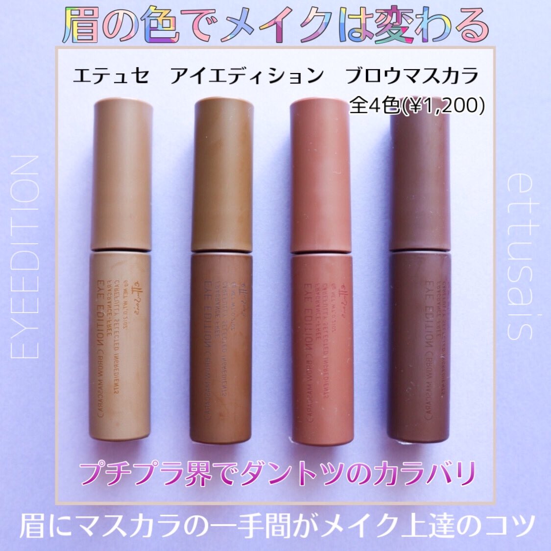眉マスカラ愛好家すぎてプチプラのダントツNo.1は #エテュセ だと勝手に決めてる。それくらいパールの入り方・カラバリ・ブラシの先端何から何まですばらしい。特に眉毛の色は髪の毛に合わせなきゃいけないと思っている人に使って欲しい垢抜けカラー揃い。眉は髪の毛に合わせるな。メイクに合わせよ