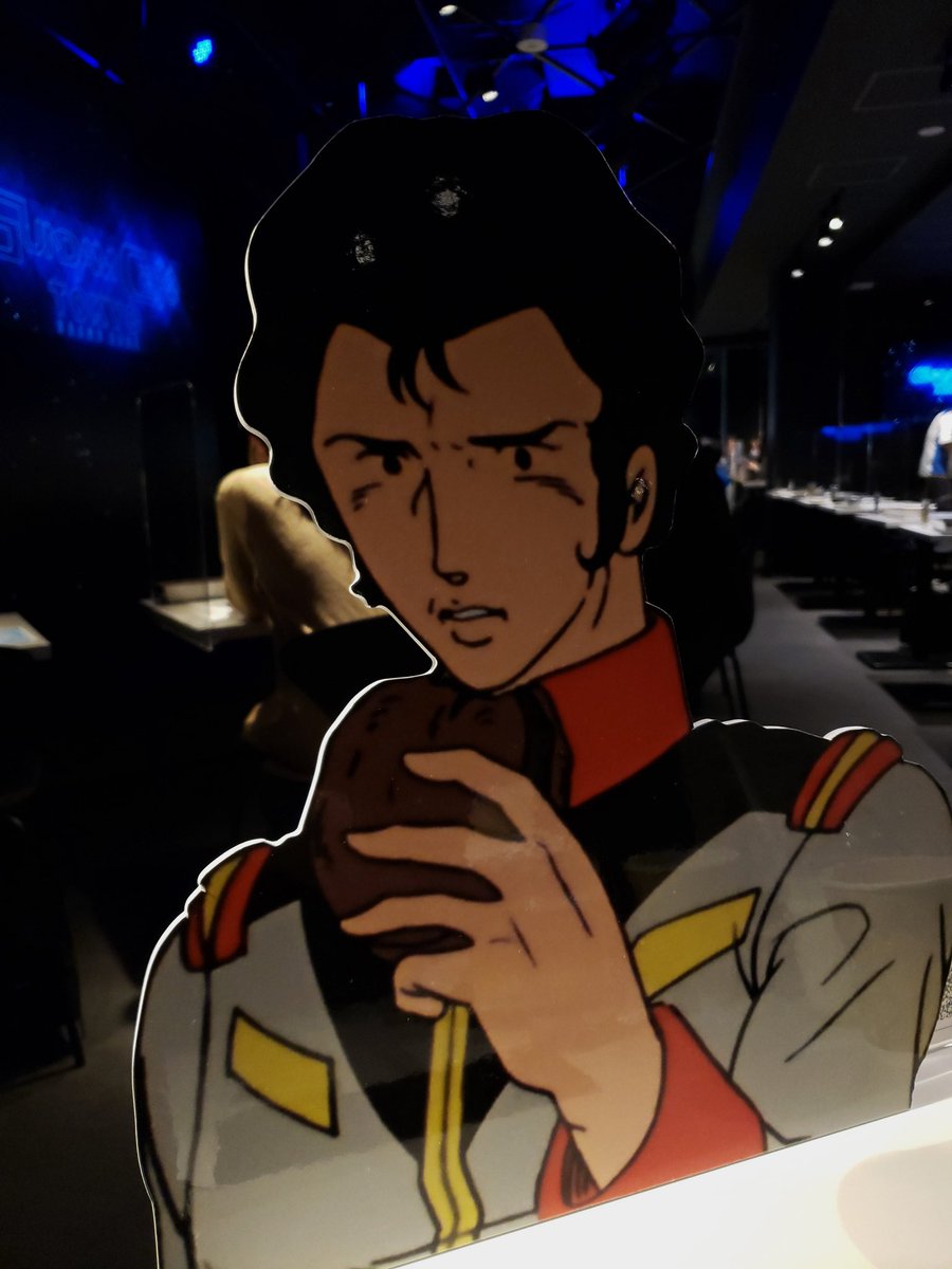ガンダムカフェTOKYO BRAND CORE、本日から再現食祭がスタート。 「ブライト・ノア~なりきり究極再現バーガー~」を注文すると、ブライトの半身パネルの貸し出しが。ブライトと向かい合って食べることができます。店内奥で艦長たくさんスタンバってる
