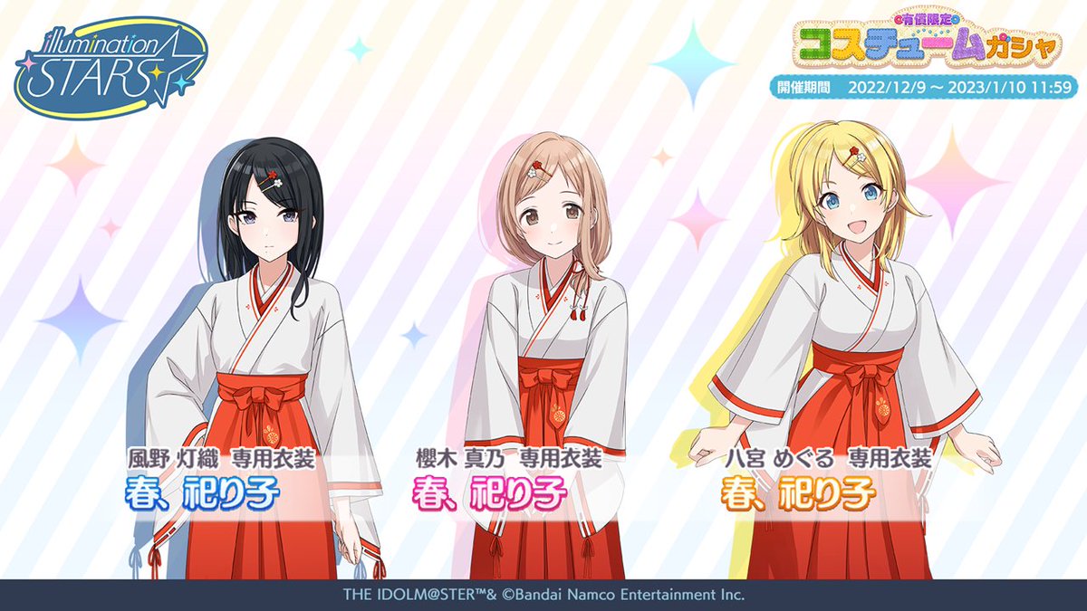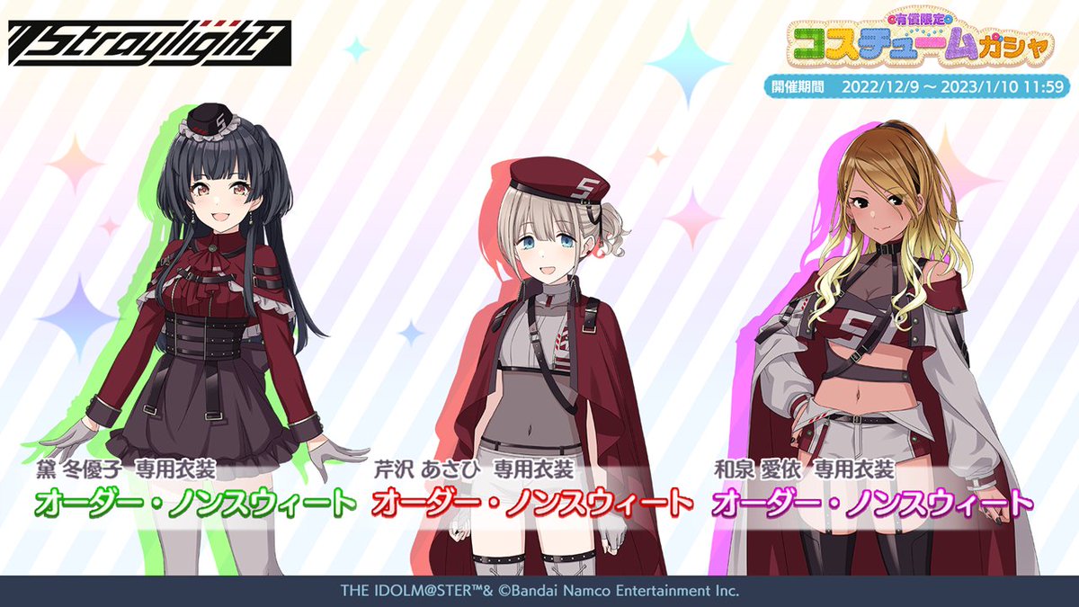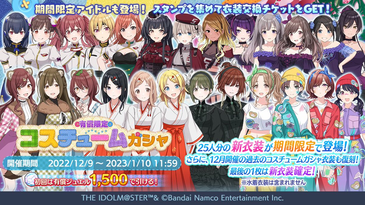 12月9日(金)より、アイドルのコスチュームに加えて、期間限定アイドルも登場する「有償限定 コスチュームガシャ」を開催予定です♪