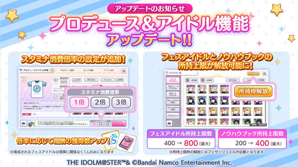 また、フェスアイドルとノウハウブックの所持数の上限が解放可能になりました!