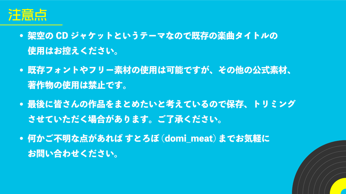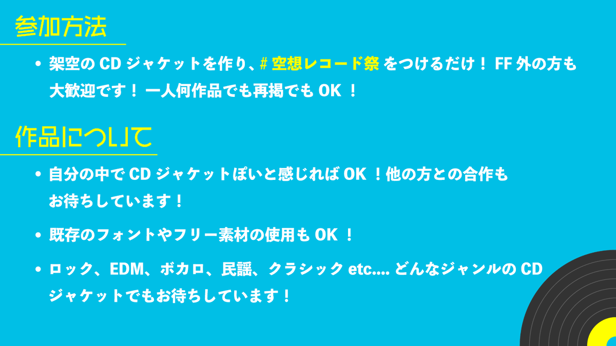 音楽、写真、イラスト、デザインが好きな皆さんで自分が作りたい架空のCDジャケットを作る #空想レコード祭 を開催したいと思います!多くの方に参加してもらえると幸いですよろしくお願いします🎧🎧