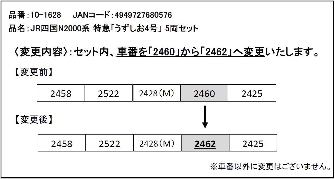11月発売予定『JR四国 N2000系 特急「うずしお4号」5両セット』につきまして、仕様上の都合により、一部車番を変更させていただきます。