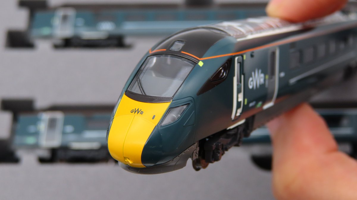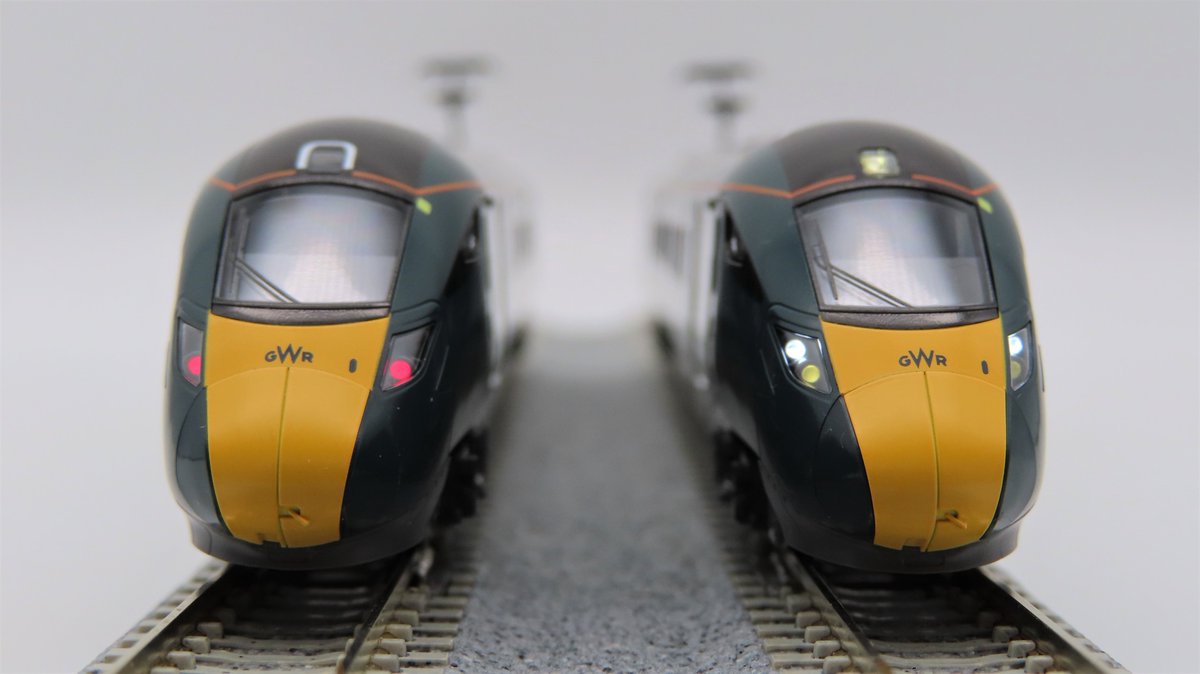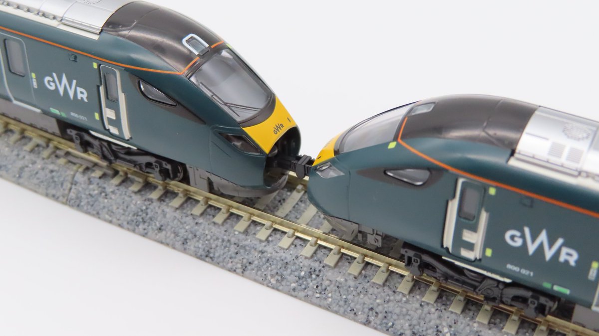 「英国鉄道Class800/0 GWR」の量産サンプルが届きました!シックなグリーンの車体に鮮やかな黄色と表記類が入った前面、ライトの点灯状態などがご確認いただけます。付属のドローバーを使用することで、実車でも多く見られる堂々の2編成併結もお楽しみいただけます。