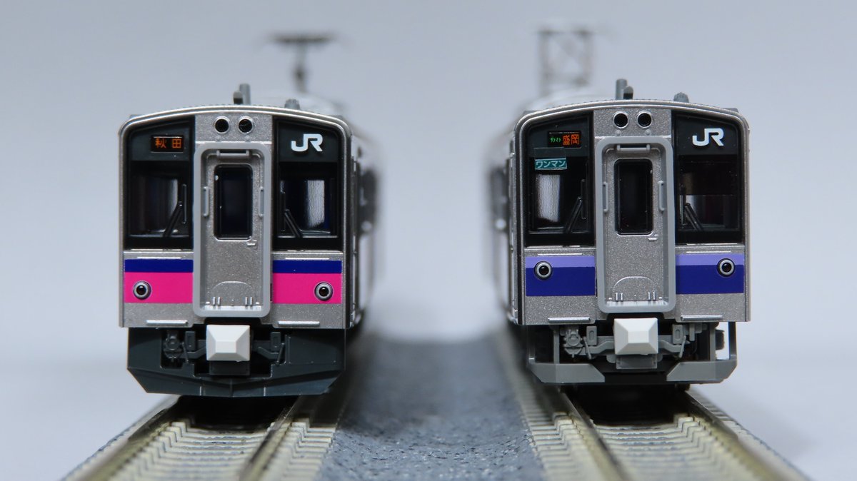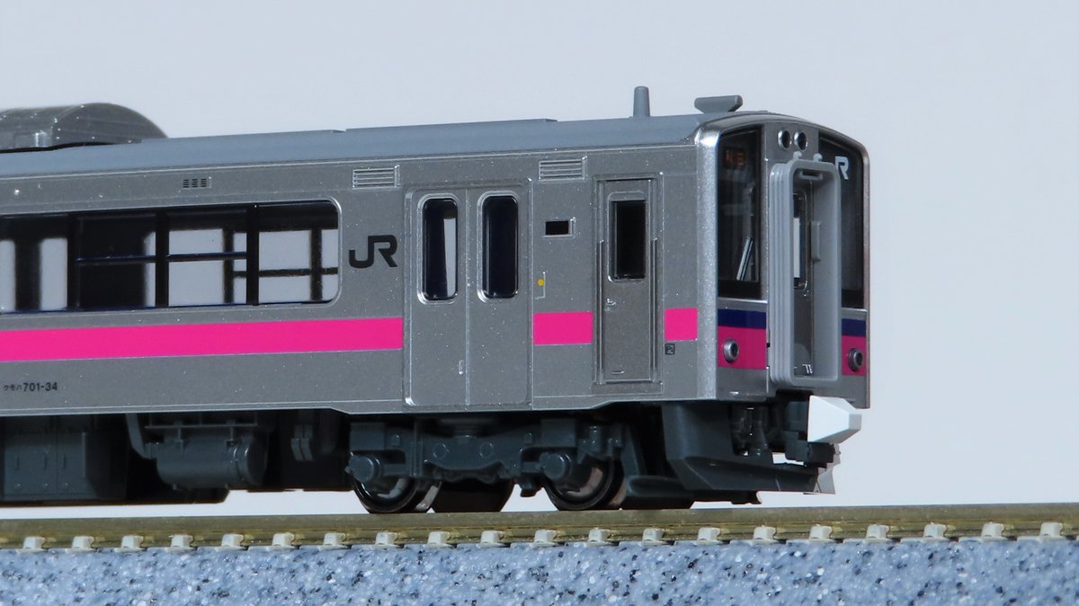 今月出荷予定の701系秋田色。鮮やかなピンク帯の入った試作品をご紹介!0番台の特徴である床下発電機や下寄りのテールライトを再現しています。シングルアームパンタグラフや強化形スカートも相まってこれまでの701系製品とは異なった表情になっています。katomodels.com/product/n/701k…