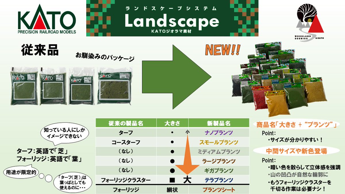 長らく定番だった「ターフ」「フォーリッジ」などのジオラマ用のグリーン素材が、「プランツ」素材として製品名・パッケージが大幅リニューアル!これまでになかった新色や、新しい粒のサイズで表現の幅が大きく広がります。