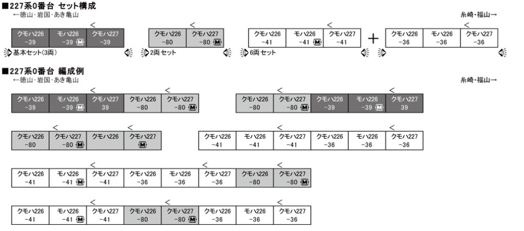 227系は3セット形態で製品化!特別企画品6両セット、ベストセレクション3両セットは中間モハ、2両セットは先頭クモハに動力車を設定しております。短い2両から最長8両まで、様々な編成をお楽しみいただけます♪6両セットには豊富な行先シールを付属予定!