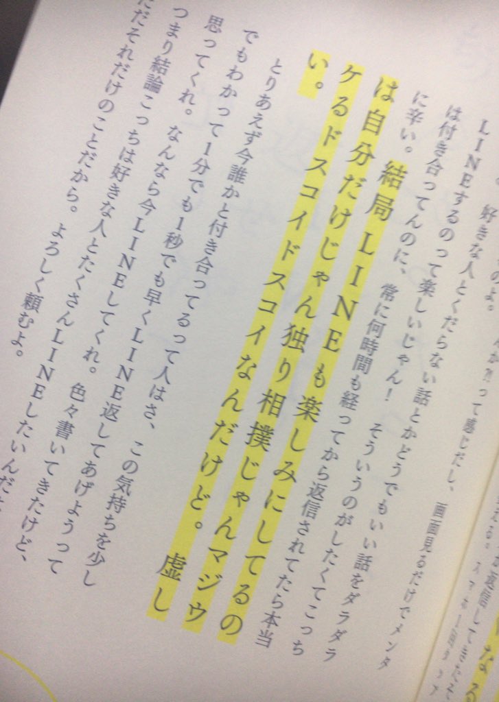 恋人にはLINE早く返せって思ってる訳じゃなくて、ただ本当にどうでもいいことを伝えてくれたり、今日何するか予定を教えてくれたり、しんどいことがあったら相談してくれたりをする相手に1番最初に自分を選んで欲しいだけなんですよ、本当にそれだけなんです、あとLINEは5分で返せ